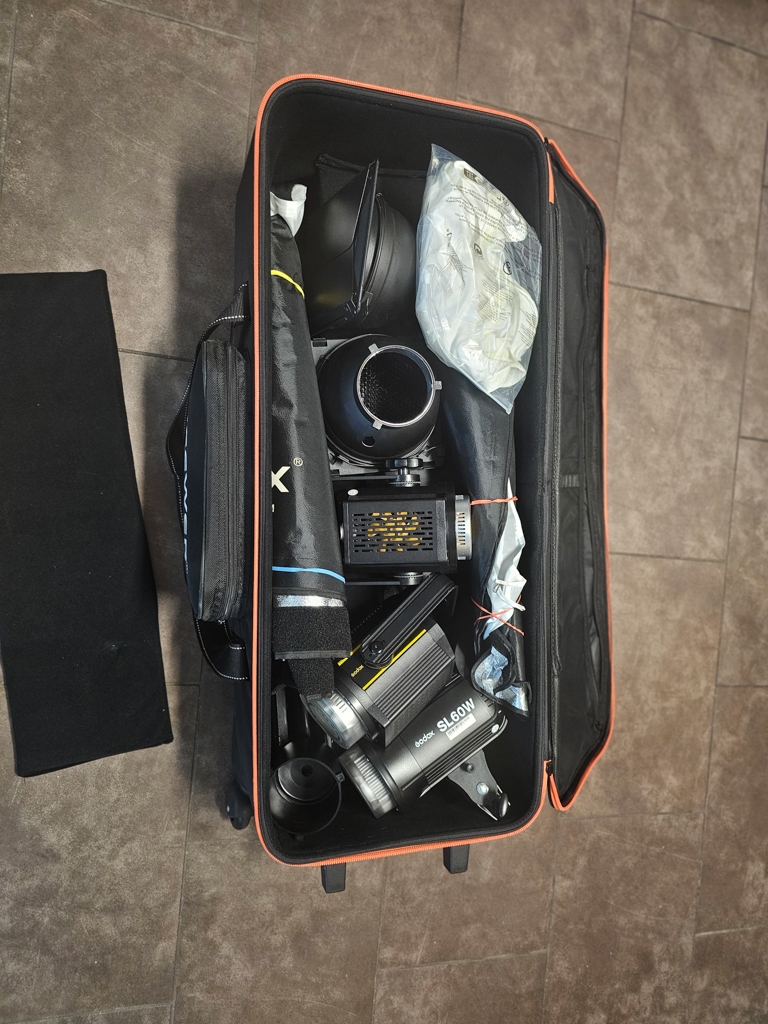 • Two pairs of Godox SL-60 with two rolling cases (one of the cases is damaged)